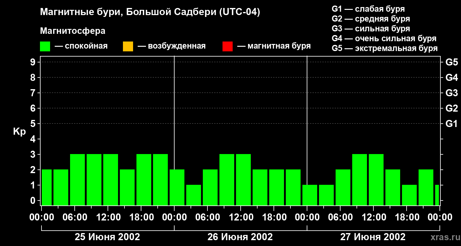 Изменения геомагнитного индекса Kp с 25 по 27 июня 2002 года для средних широт