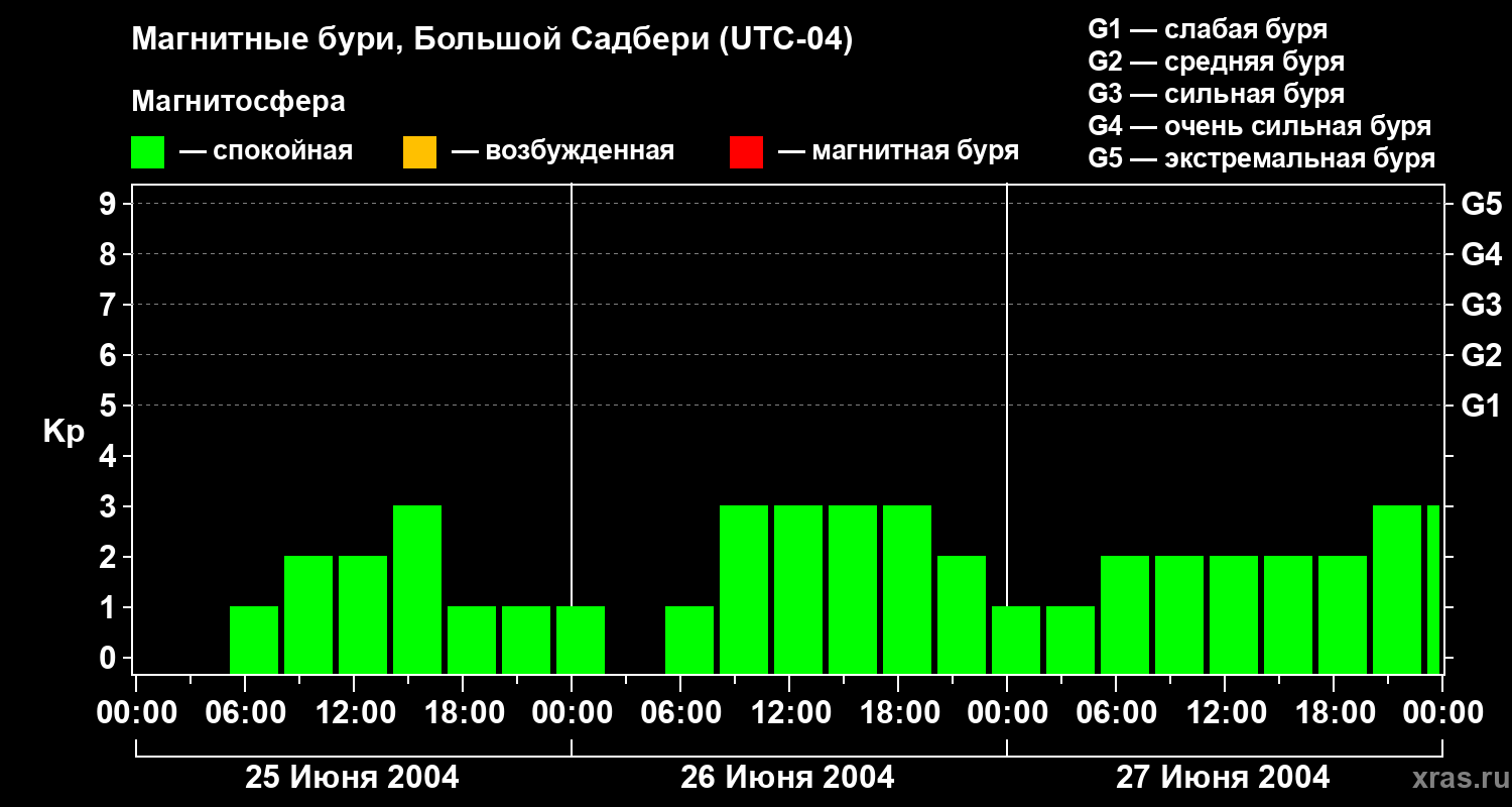 Изменения геомагнитного индекса Kp с 25 по 27 июня 2004 года для средних широт