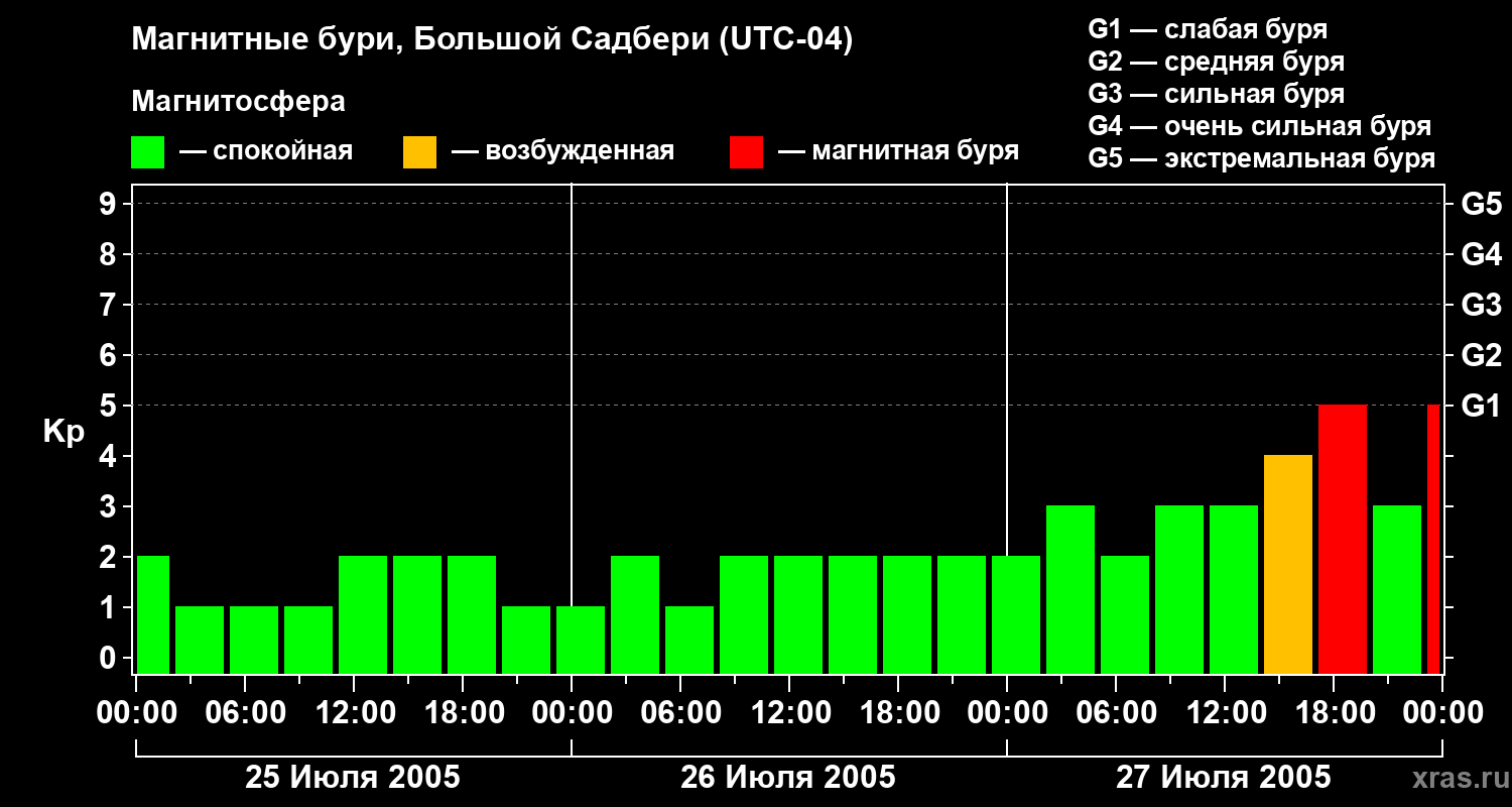 Изменения геомагнитного индекса Kp с 25 по 27 июля 2005 года для средних широт