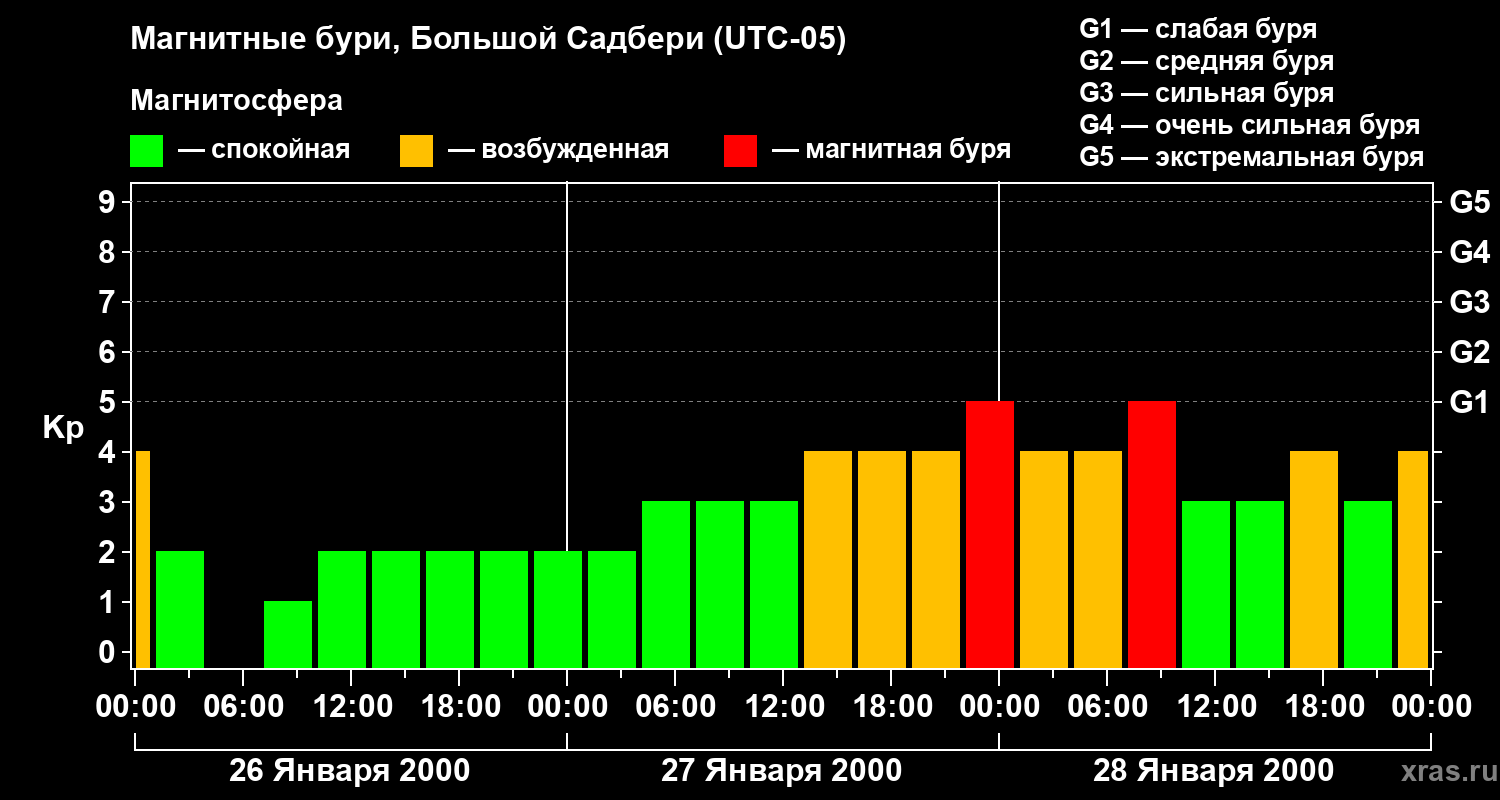 Изменения геомагнитного индекса Kp с 26 по 28 января 2000 года для средних широт
