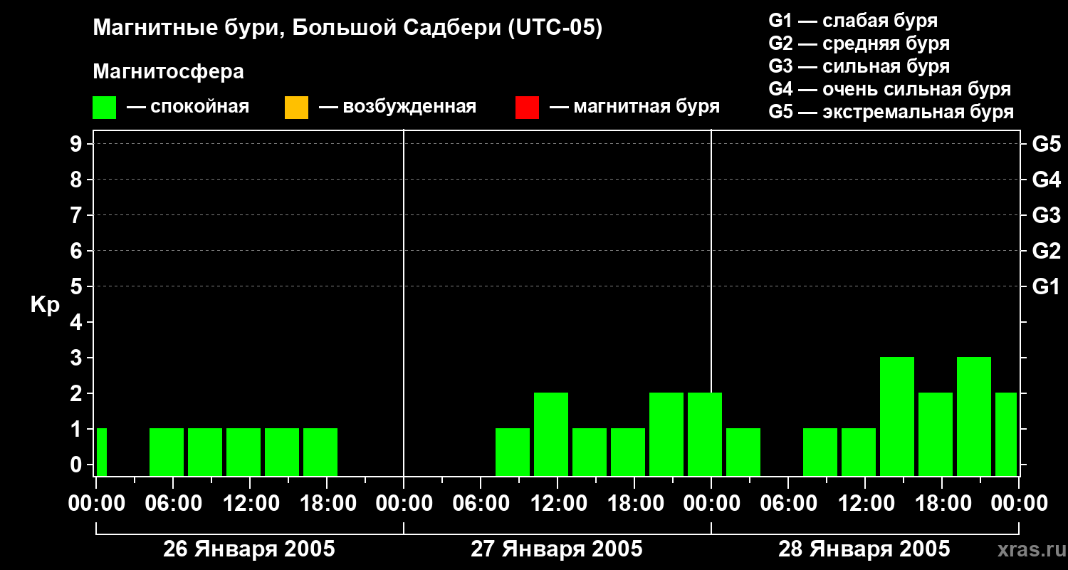 Изменения геомагнитного индекса Kp с 26 по 28 января 2005 года для средних широт