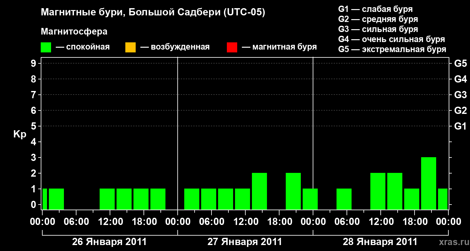 Изменения геомагнитного индекса Kp с 26 по 28 января 2011 года для средних широт