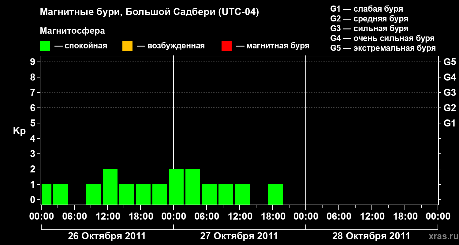 Изменения геомагнитного индекса Kp с 26 по 28 октября 2011 года для средних широт