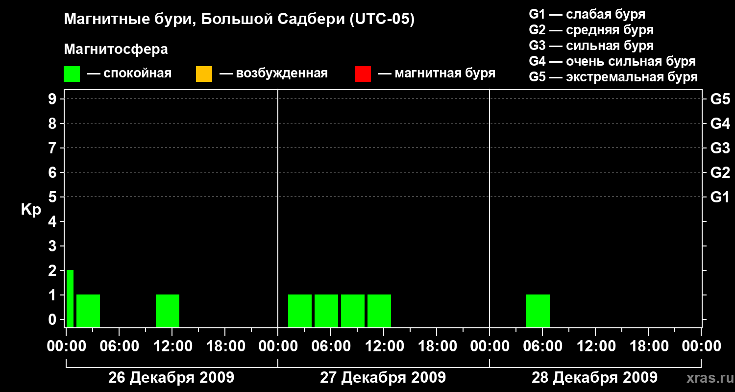 Изменения геомагнитного индекса Kp с 26 по 28 декабря 2009 года для средних широт