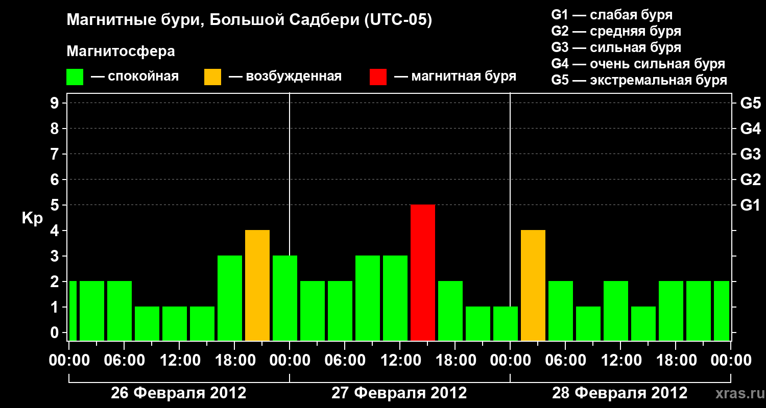 Изменения геомагнитного индекса Kp с 26 по 28 февраля 2012 года для средних широт