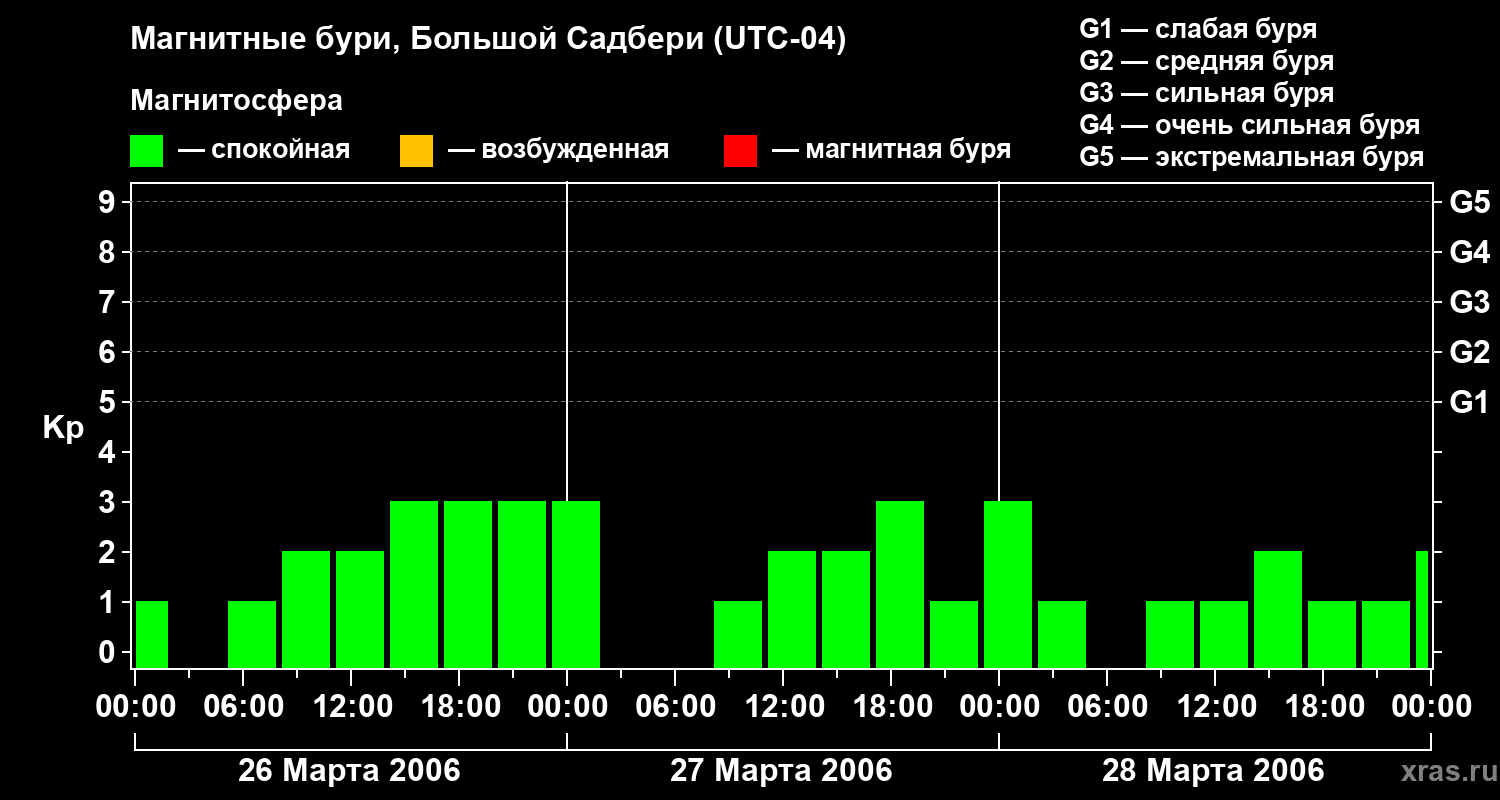 Изменения геомагнитного индекса Kp с 26 по 28 марта 2006 года для средних широт