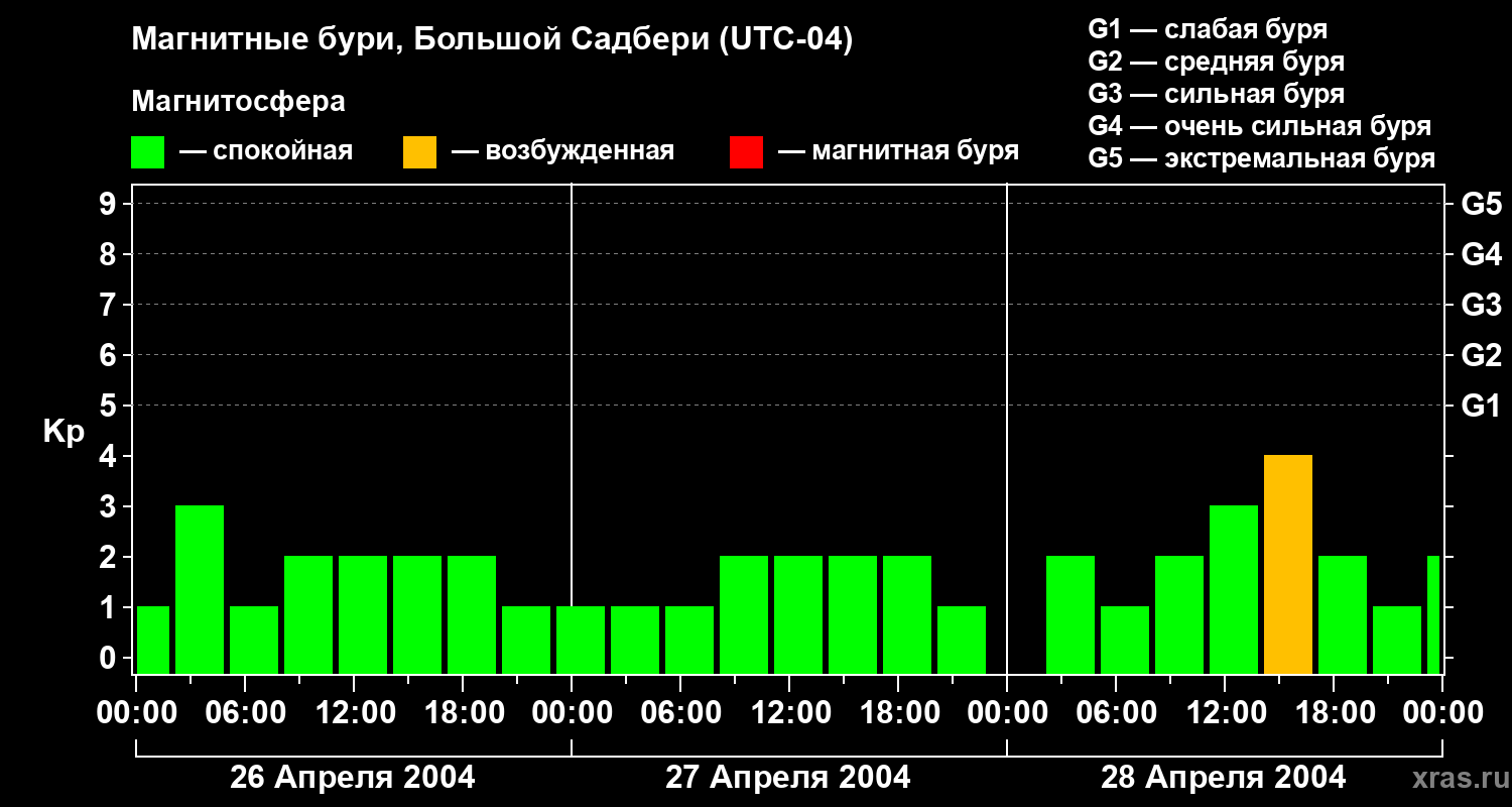 Изменения геомагнитного индекса Kp с 26 по 28 апреля 2004 года для средних широт