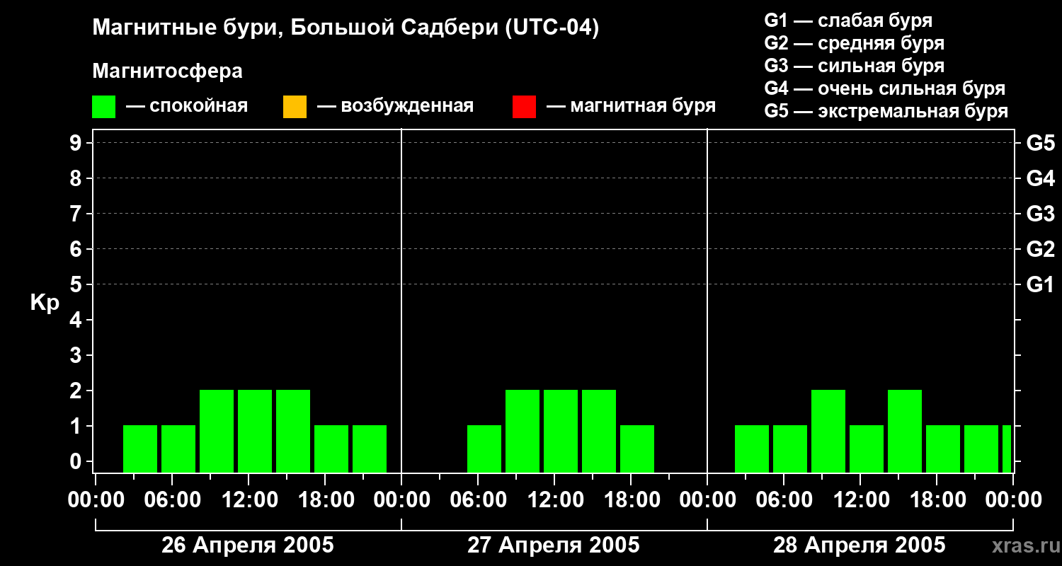 Изменения геомагнитного индекса Kp с 26 по 28 апреля 2005 года для средних широт