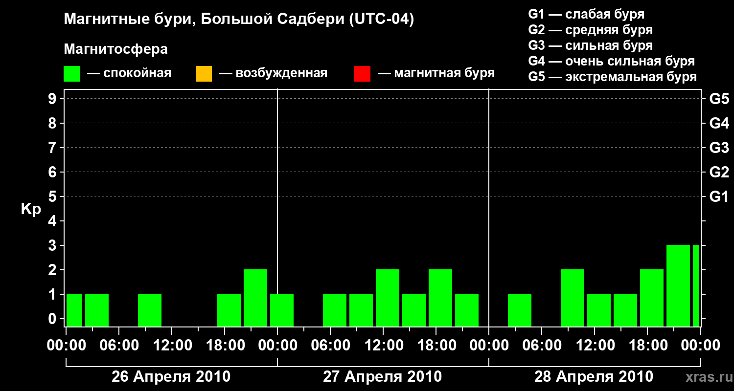 Изменения геомагнитного индекса Kp с 26 по 28 апреля 2010 года для средних широт