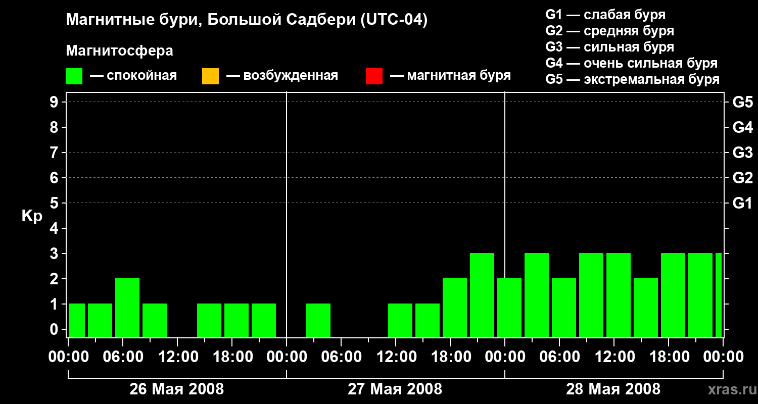 Изменения геомагнитного индекса Kp с 26 по 28 мая 2008 года для средних широт