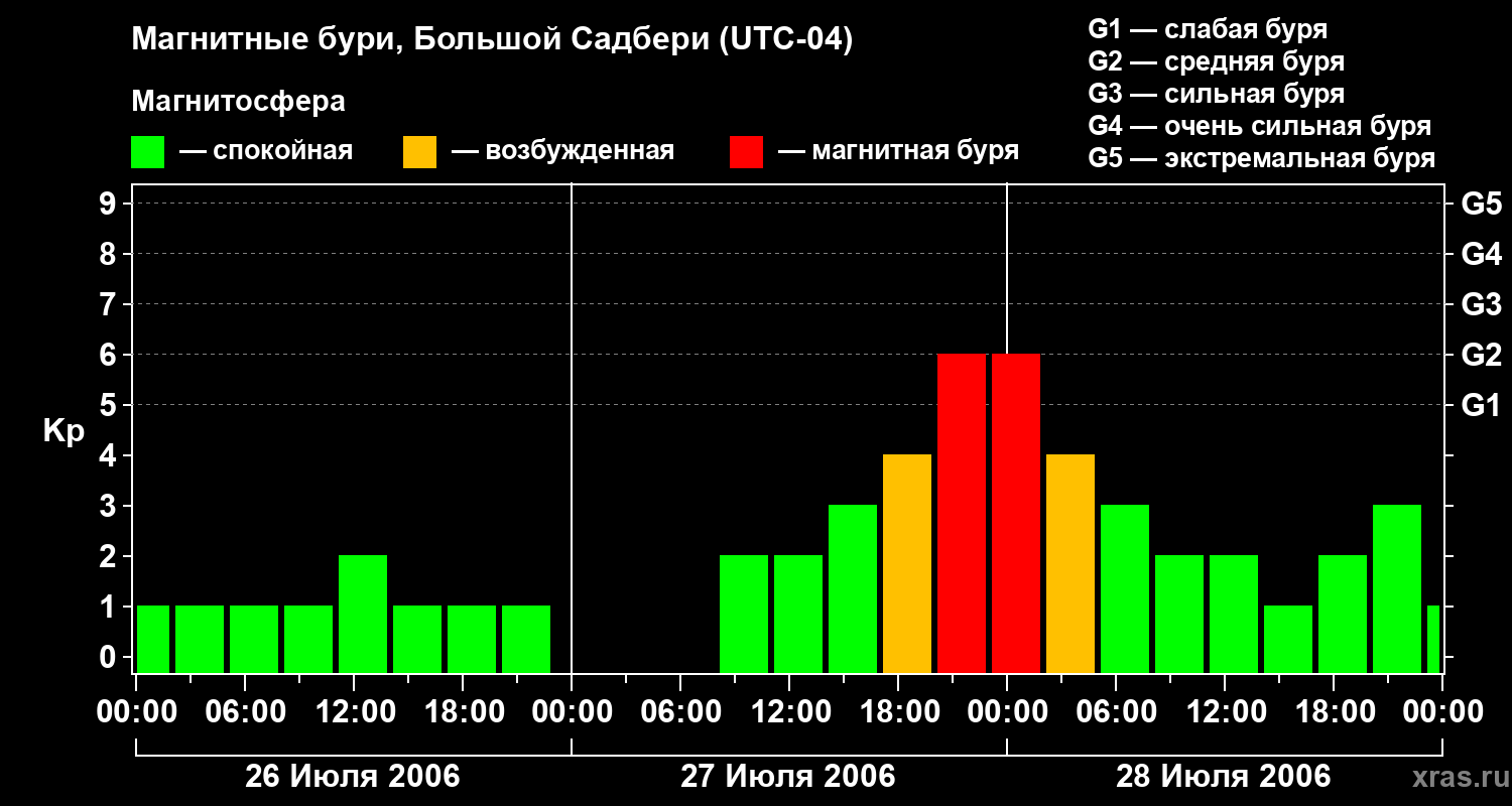 Изменения геомагнитного индекса Kp с 26 по 28 июля 2006 года для средних широт