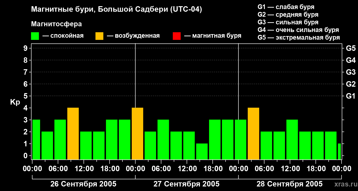 Изменения геомагнитного индекса Kp с 26 по 28 сентября 2005 года для средних широт