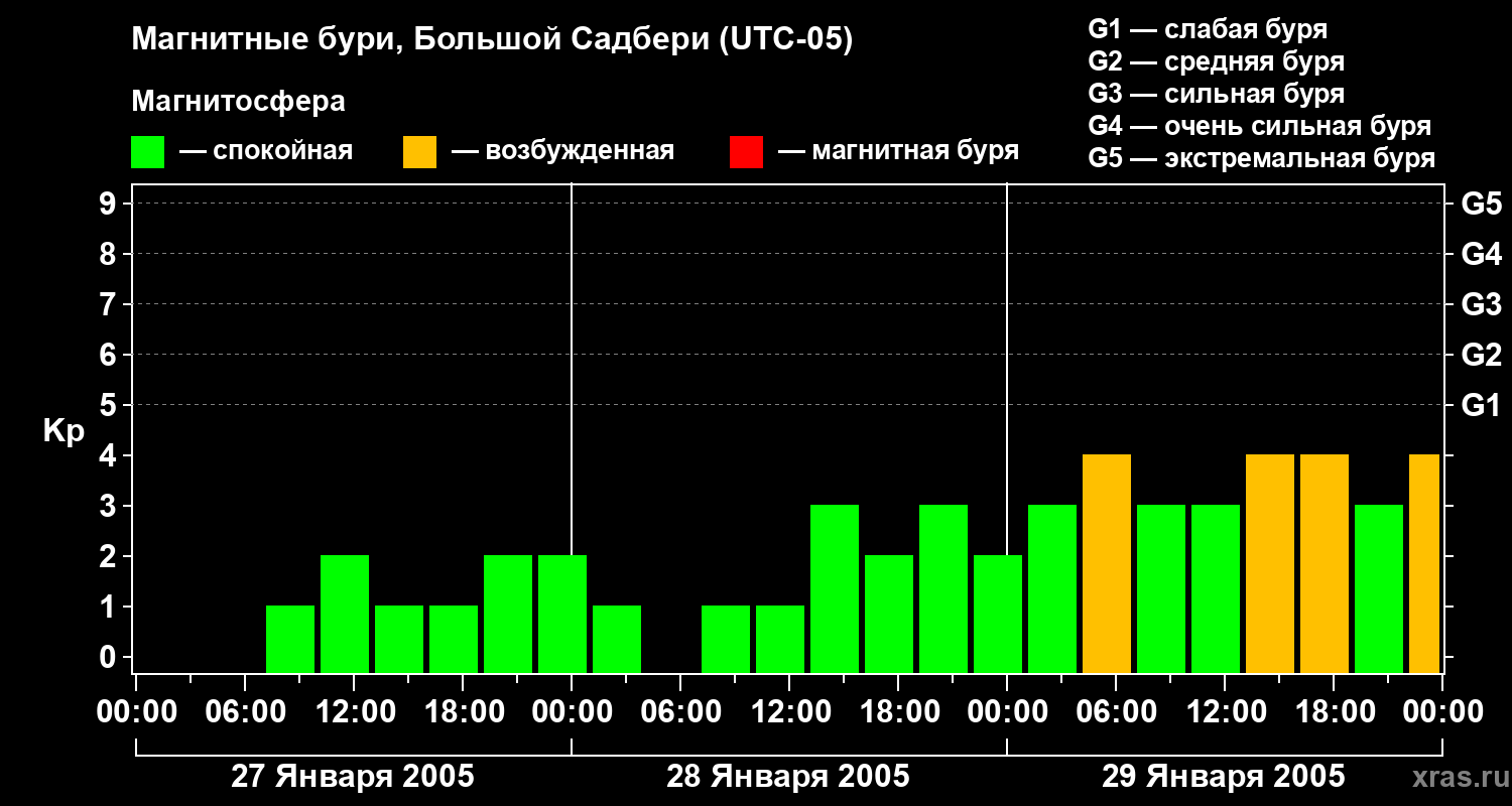 Изменения геомагнитного индекса Kp с 27 по 29 января 2005 года для средних широт