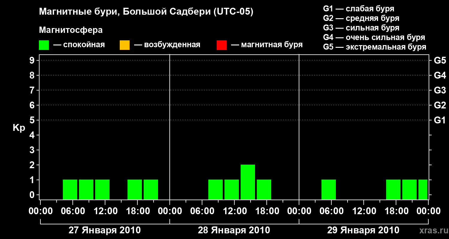 Изменения геомагнитного индекса Kp с 27 по 29 января 2010 года для средних широт