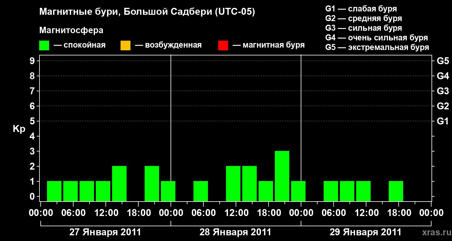 Изменения геомагнитного индекса Kp с 27 по 29 января 2011 года для средних широт