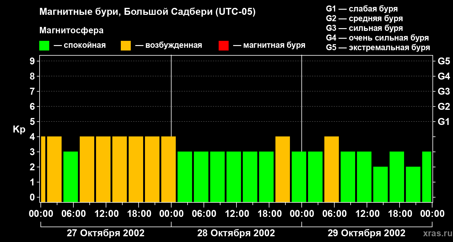 Изменения геомагнитного индекса Kp с 27 по 29 октября 2002 года для средних широт