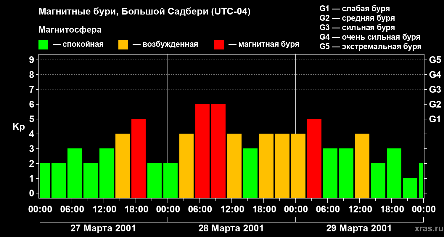 Изменения геомагнитного индекса Kp с 27 по 29 марта 2001 года для средних широт