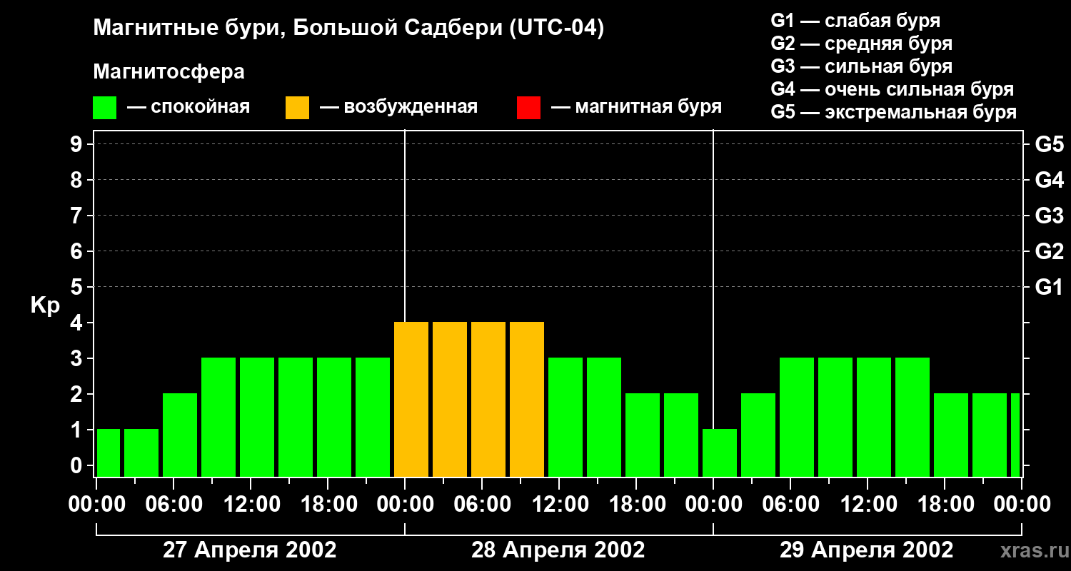 Изменения геомагнитного индекса Kp с 27 по 29 апреля 2002 года для средних широт