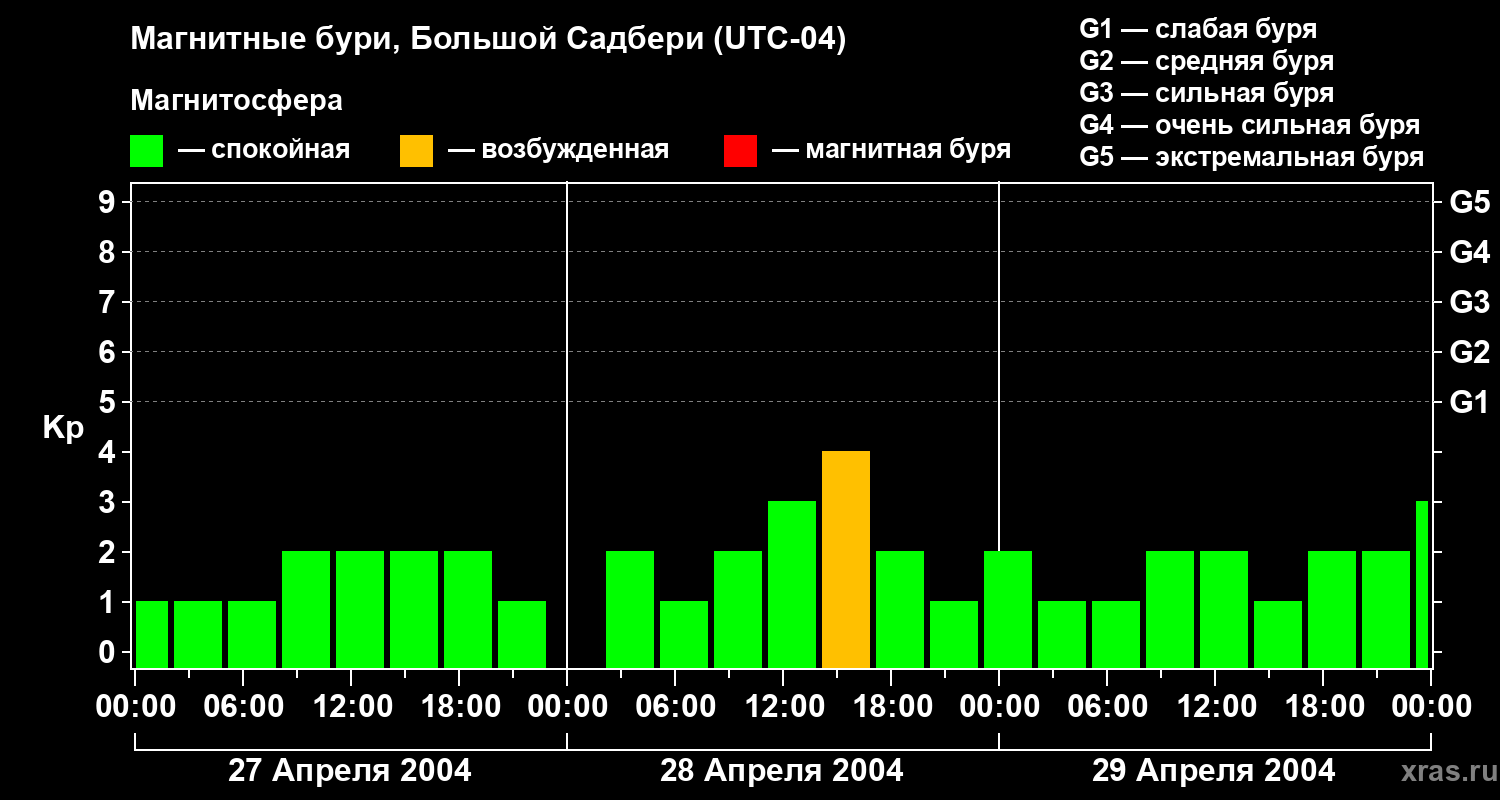 Изменения геомагнитного индекса Kp с 27 по 29 апреля 2004 года для средних широт