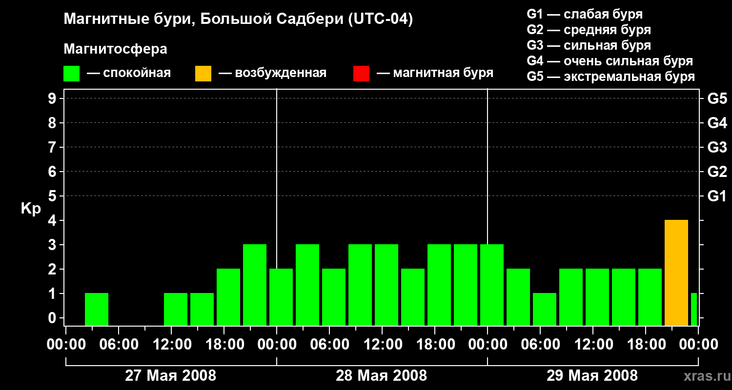 Изменения геомагнитного индекса Kp с 27 по 29 мая 2008 года для средних широт