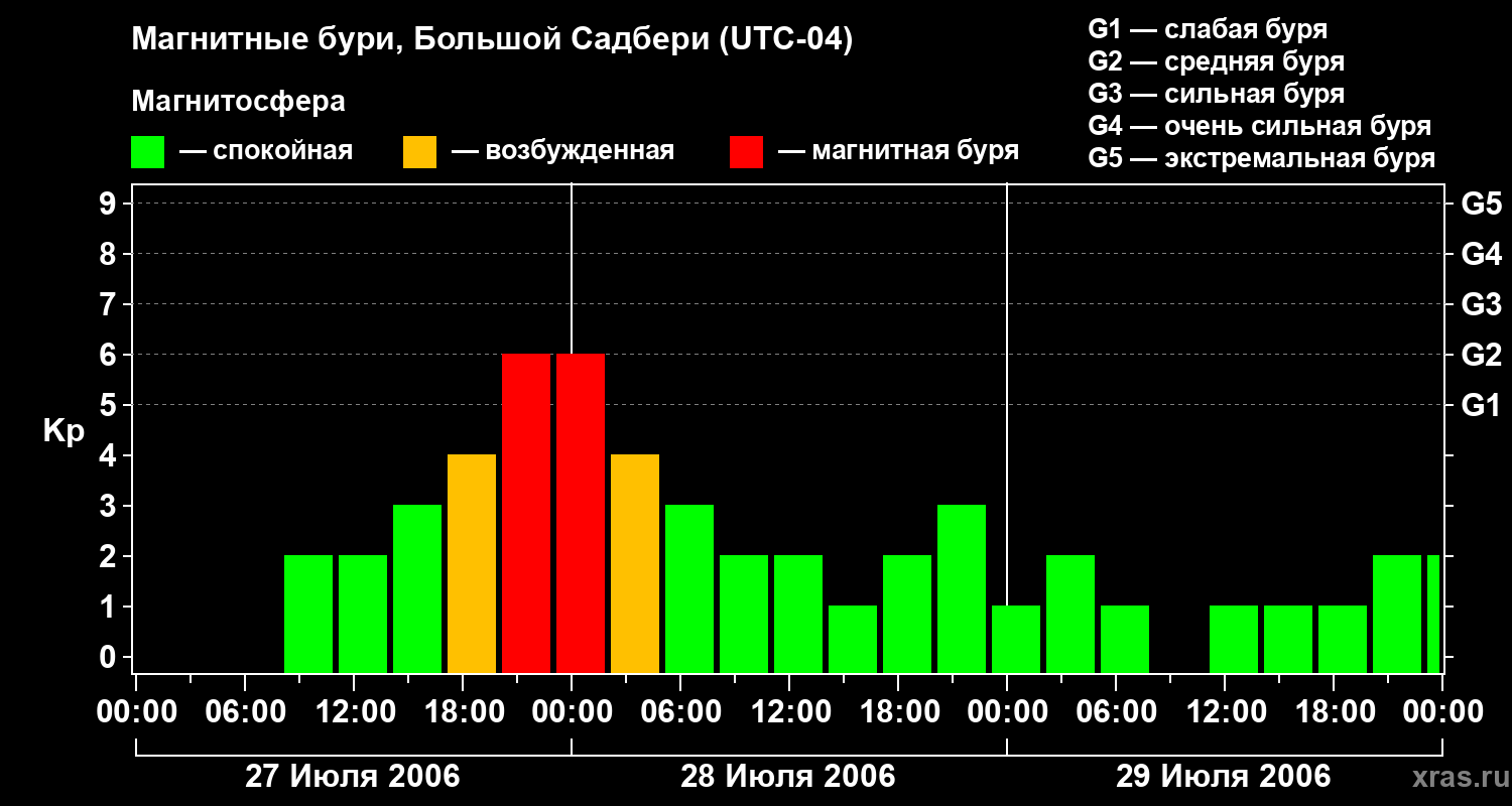 Изменения геомагнитного индекса Kp с 27 по 29 июля 2006 года для средних широт