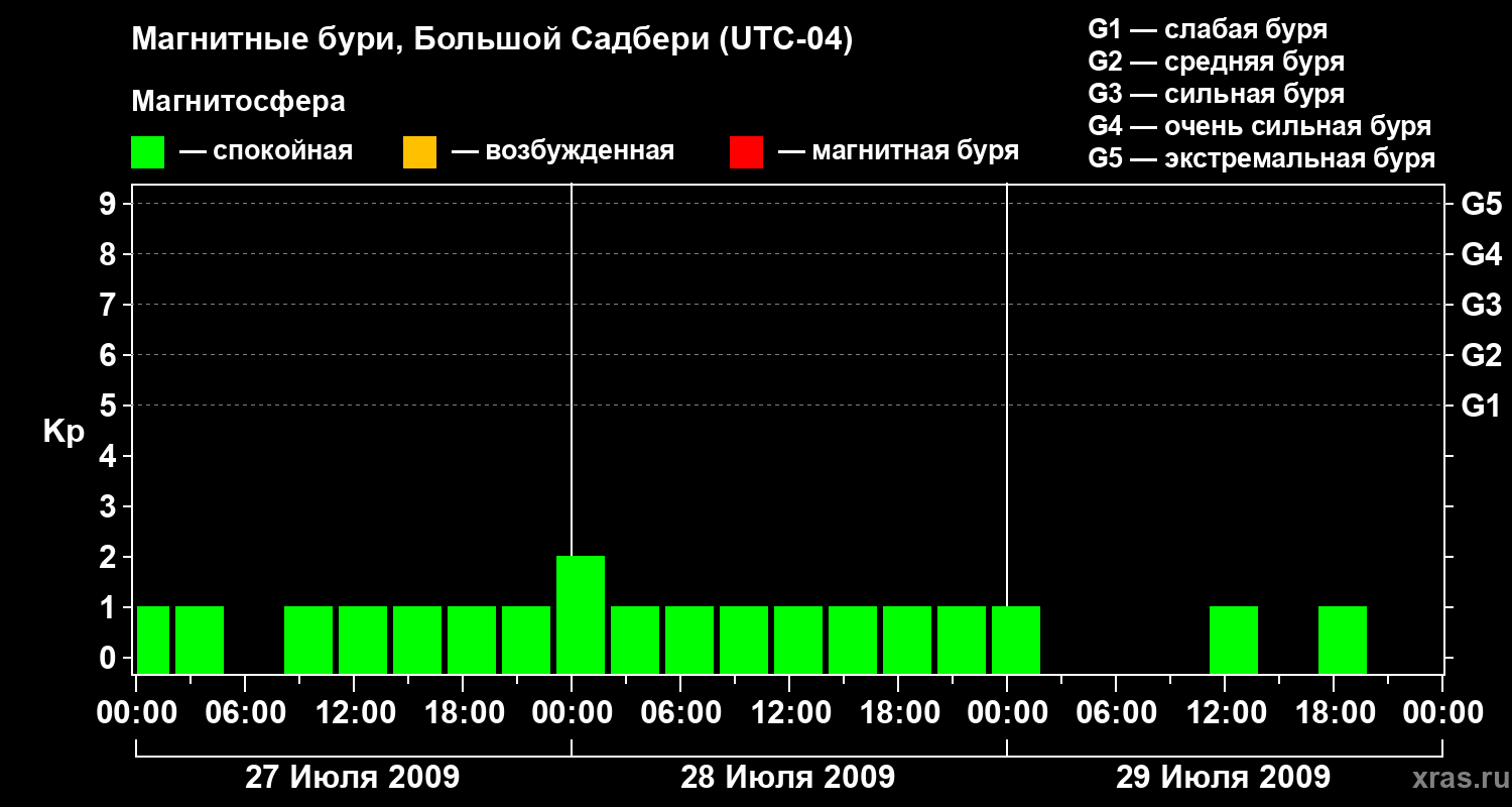 Изменения геомагнитного индекса Kp с 27 по 29 июля 2009 года для средних широт