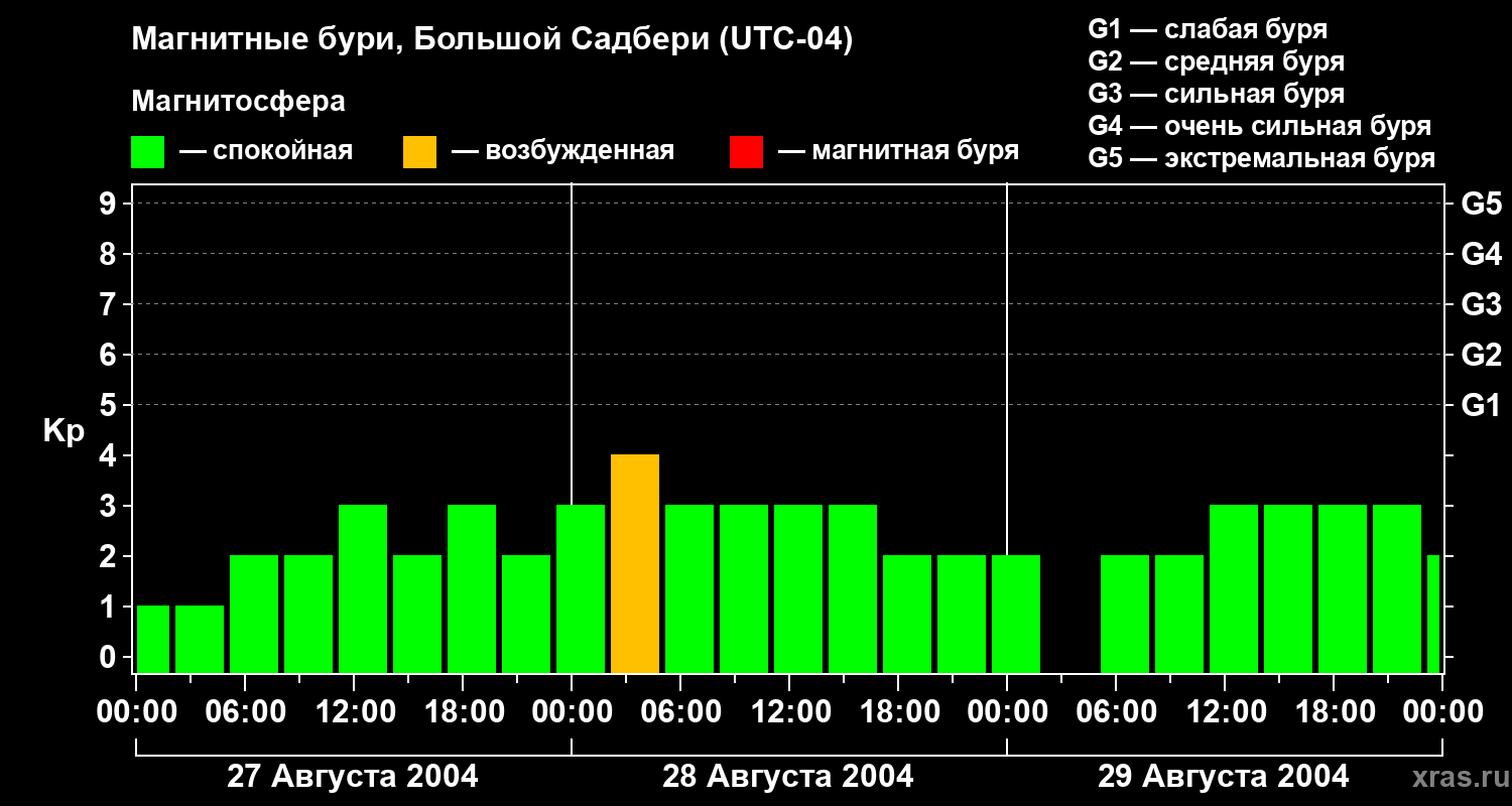 Изменения геомагнитного индекса Kp с 27 по 29 августа 2004 года для средних широт