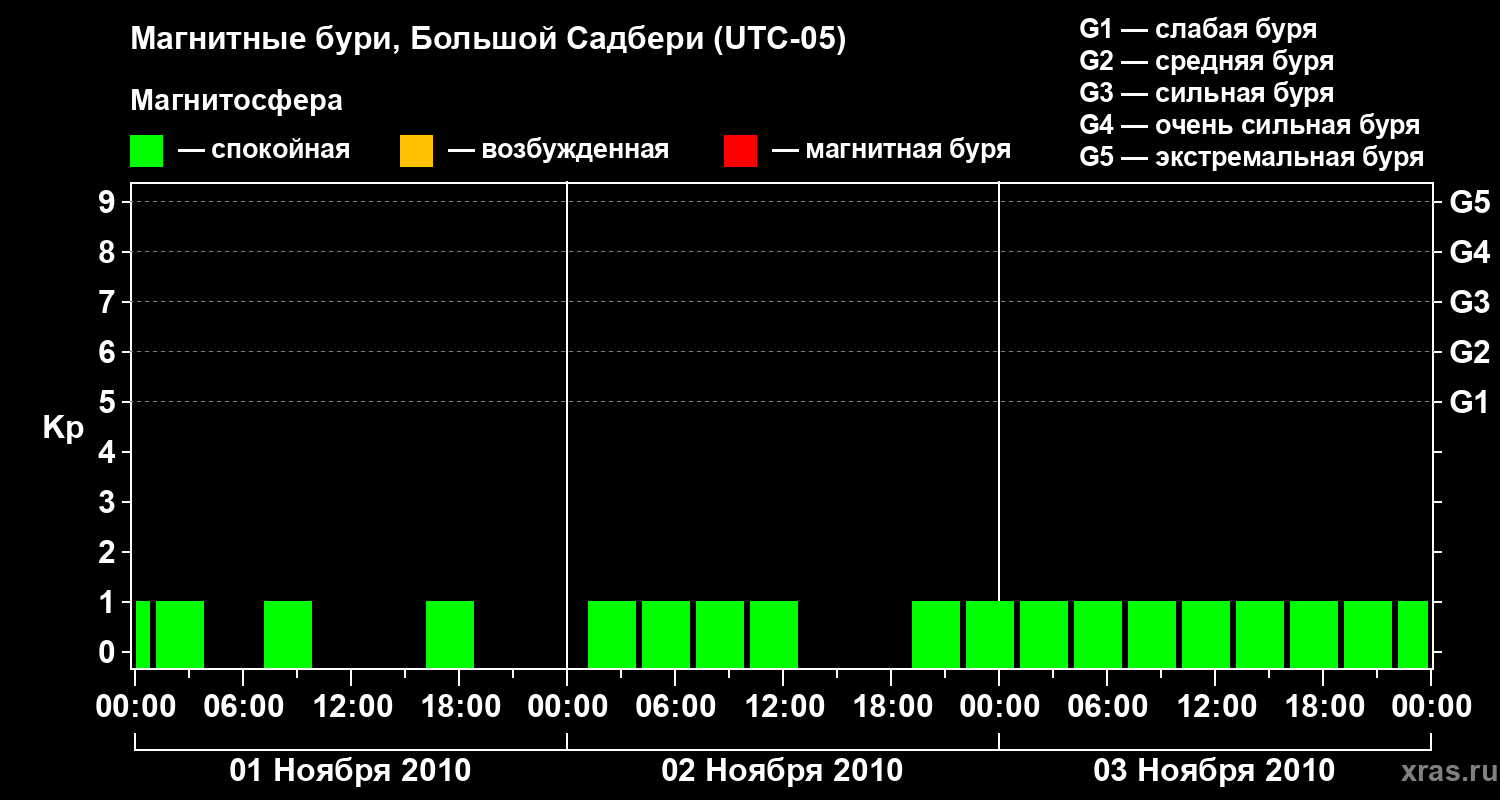 Изменения геомагнитного индекса Kp с 1 по 3 ноября 2010 года для средних широт