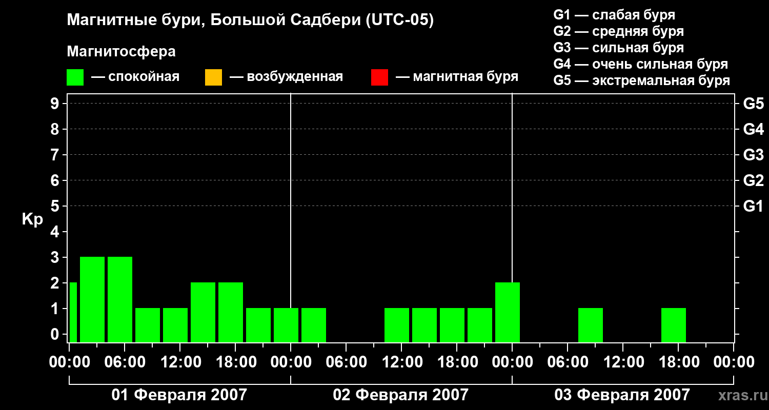 Изменения геомагнитного индекса Kp с 1 по 3 февраля 2007 года для средних широт