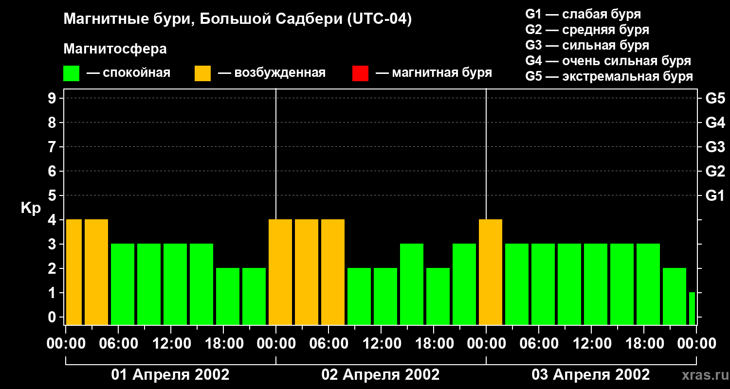 Изменения геомагнитного индекса Kp с 1 по 3 апреля 2002 года для средних широт
