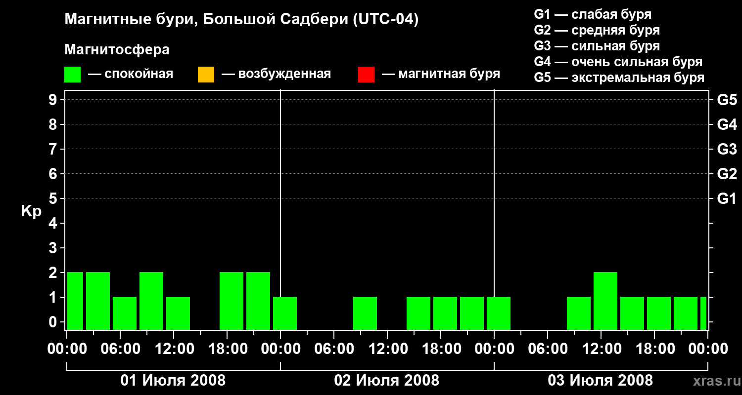 Изменения геомагнитного индекса Kp с 1 по 3 июля 2008 года для средних широт
