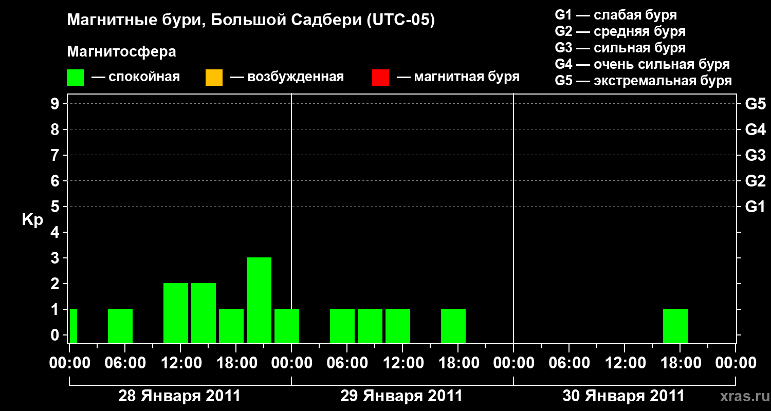 Изменения геомагнитного индекса Kp с 28 по 30 января 2011 года для средних широт