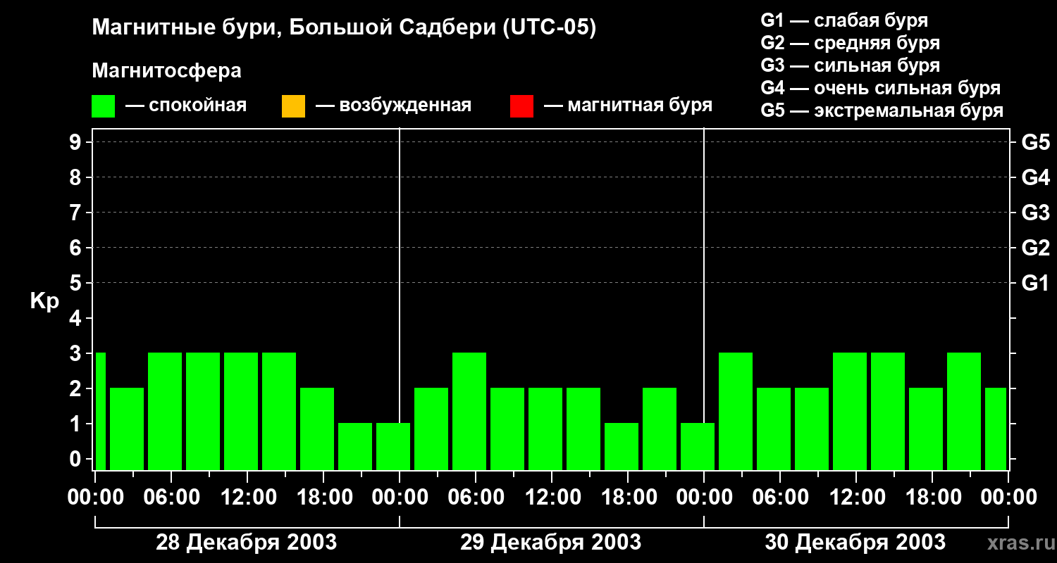 Изменения геомагнитного индекса Kp с 28 по 30 декабря 2003 года для средних широт