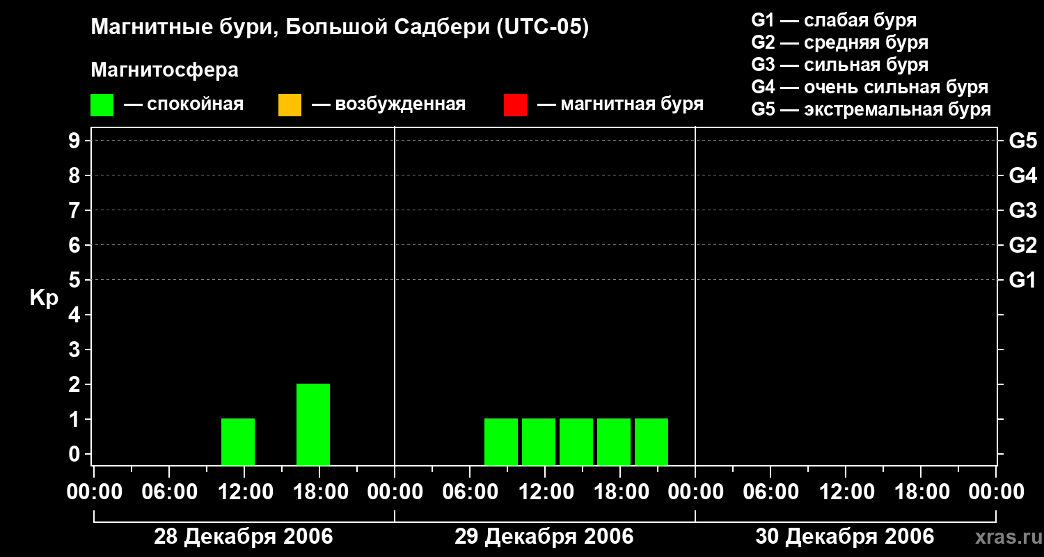Изменения геомагнитного индекса Kp с 28 по 30 декабря 2006 года для средних широт