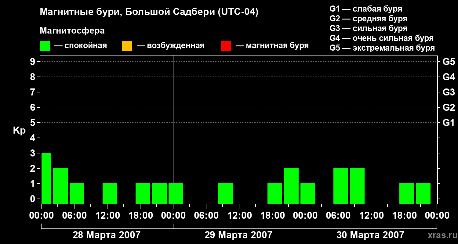 Изменения геомагнитного индекса Kp с 28 по 30 марта 2007 года для средних широт