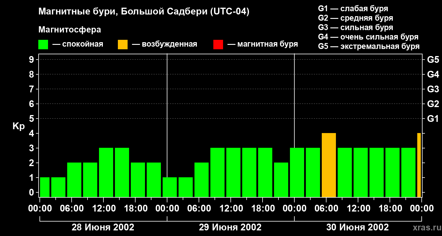 Изменения геомагнитного индекса Kp с 28 по 30 июня 2002 года для средних широт
