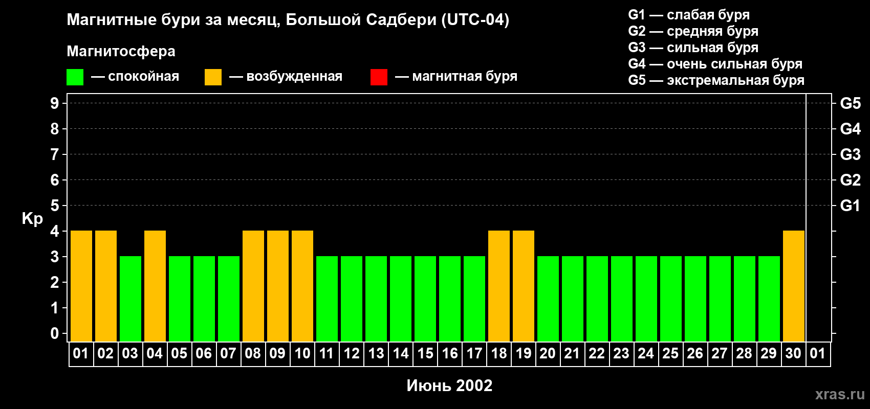 Изменения максимального суточного геомагнитного индекса Kp в июне 2002 года для средних широт