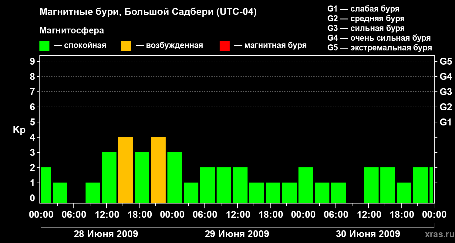 Изменения геомагнитного индекса Kp с 28 по 30 июня 2009 года для средних широт