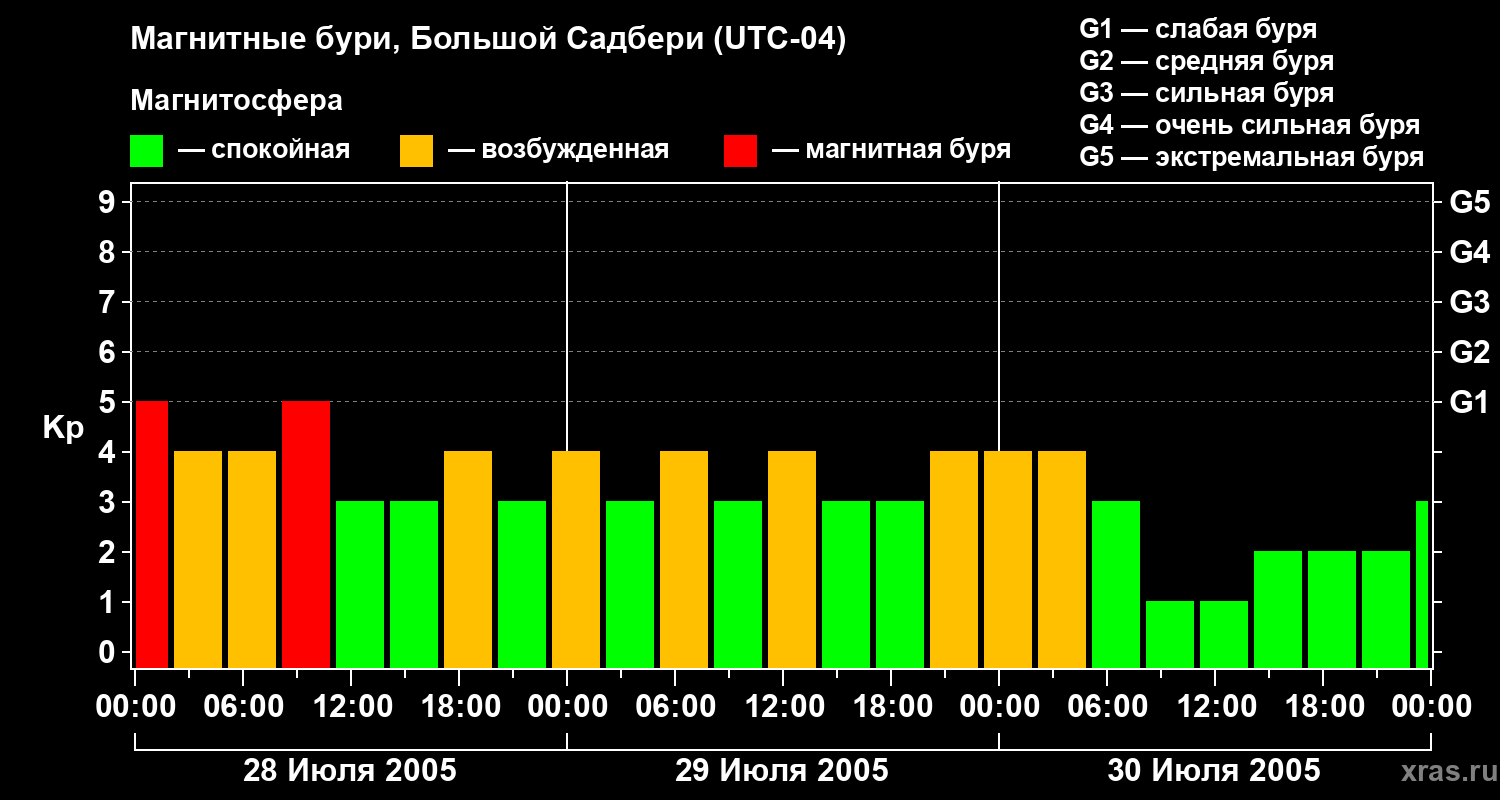 Изменения геомагнитного индекса Kp с 28 по 30 июля 2005 года для средних широт