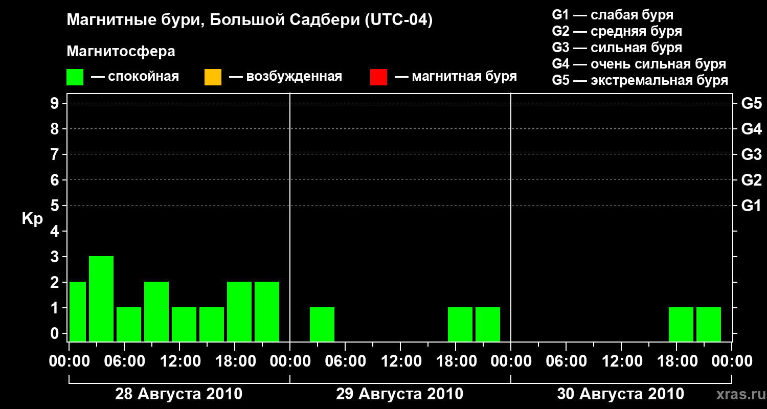 Изменения геомагнитного индекса Kp с 28 по 30 августа 2010 года для средних широт