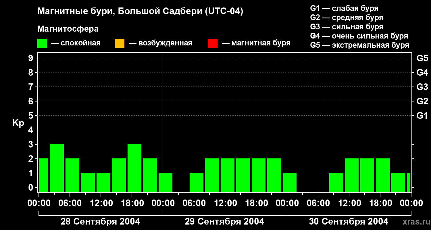 Изменения геомагнитного индекса Kp с 28 по 30 сентября 2004 года для средних широт