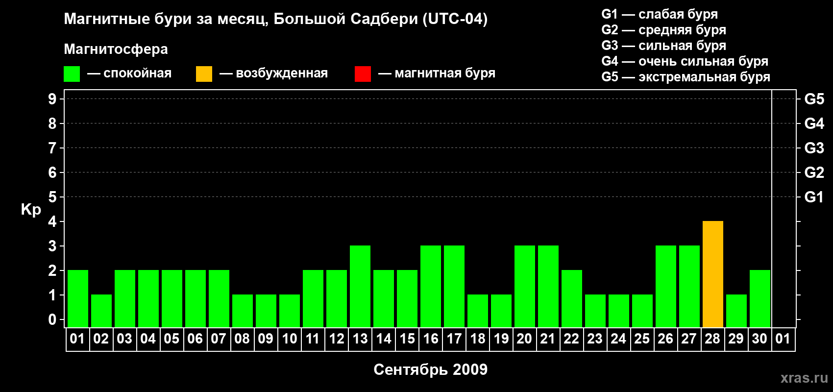 Изменения максимального суточного геомагнитного индекса Kp в сентябре 2009 года для средних широт