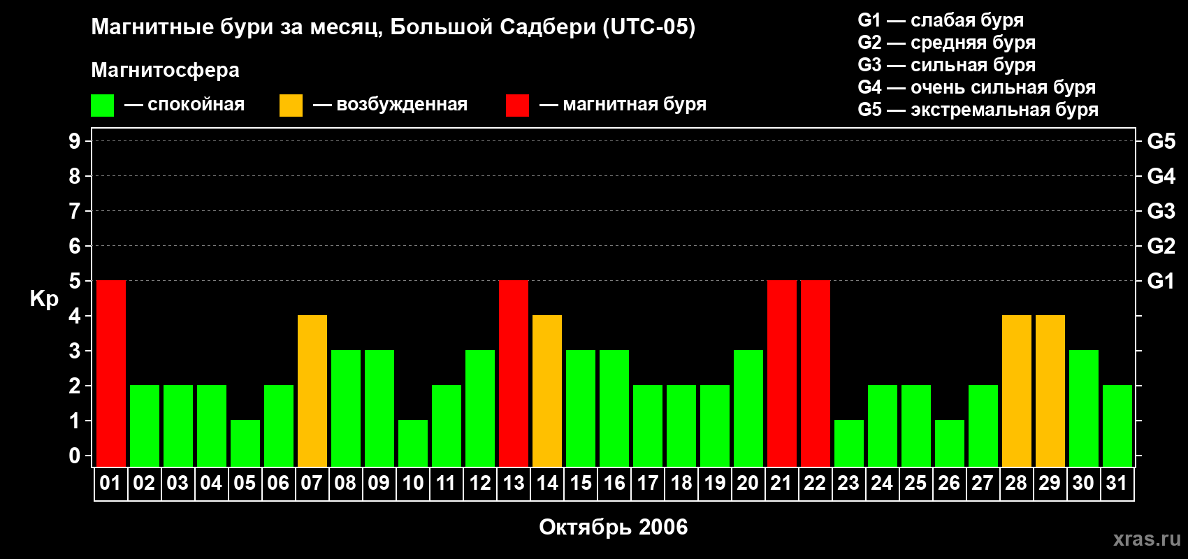 Изменения максимального суточного геомагнитного индекса Kp в октябре 2006 года для средних широт