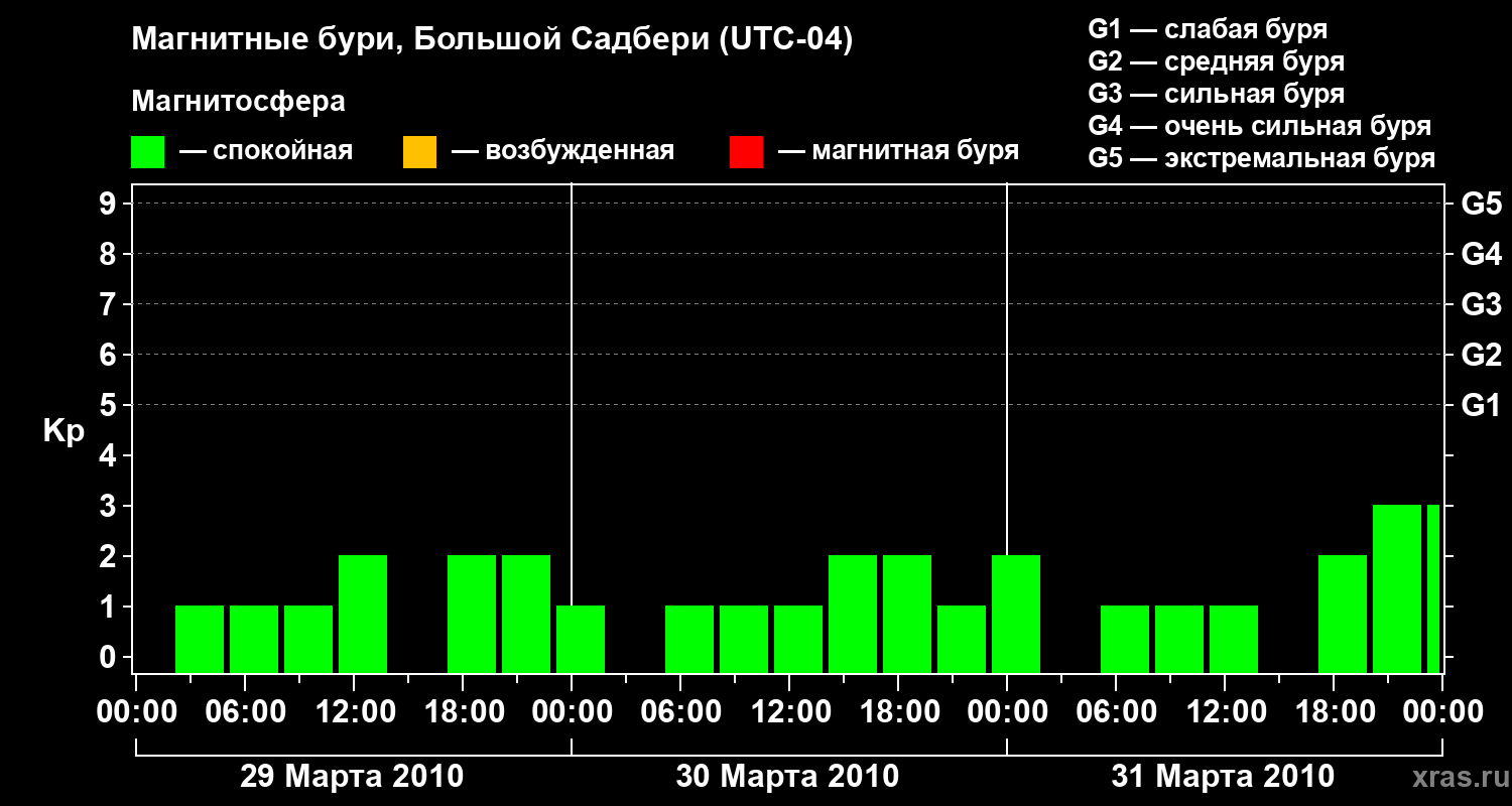 Изменения геомагнитного индекса Kp с 29 по 31 марта 2010 года для средних широт