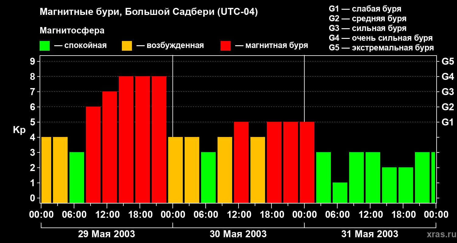 Изменения геомагнитного индекса Kp с 29 по 31 мая 2003 года для средних широт