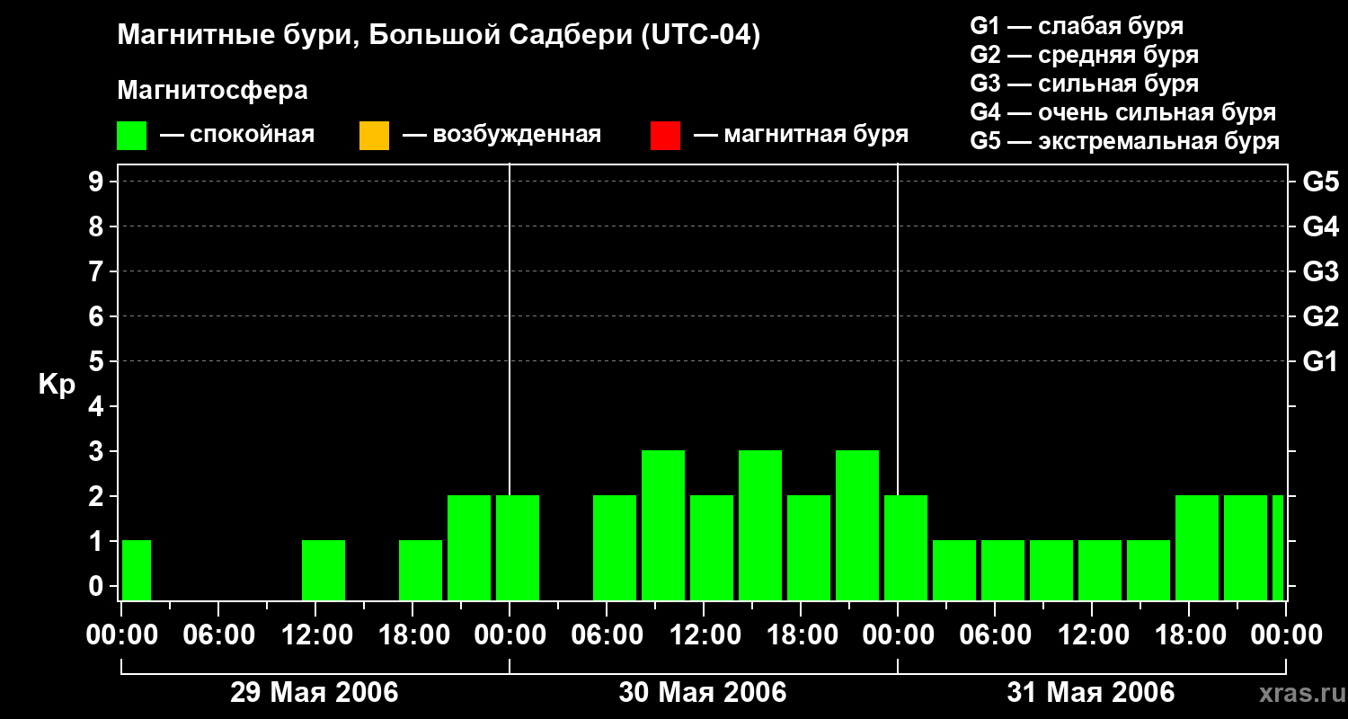 Изменения геомагнитного индекса Kp с 29 по 31 мая 2006 года для средних широт