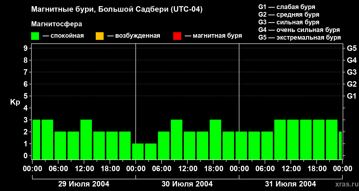 Изменения геомагнитного индекса Kp с 29 по 31 июля 2004 года для средних широт