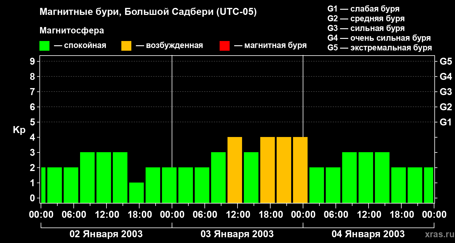 Изменения геомагнитного индекса Kp с 2 по 4 января 2003 года для средних широт