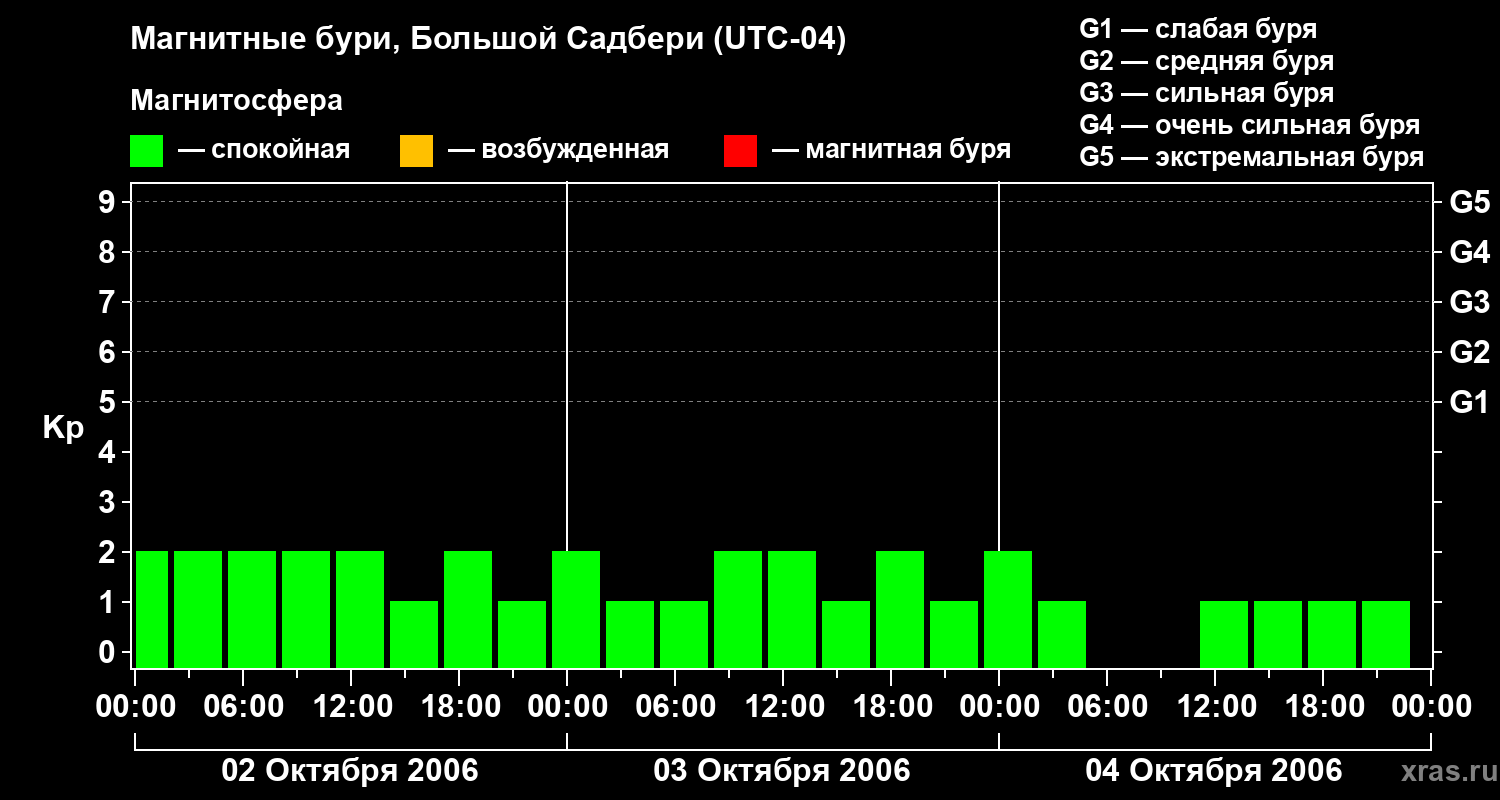 Изменения геомагнитного индекса Kp с 2 по 4 октября 2006 года для средних широт