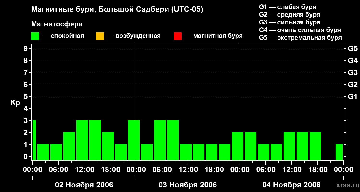 Изменения геомагнитного индекса Kp с 2 по 4 ноября 2006 года для средних широт